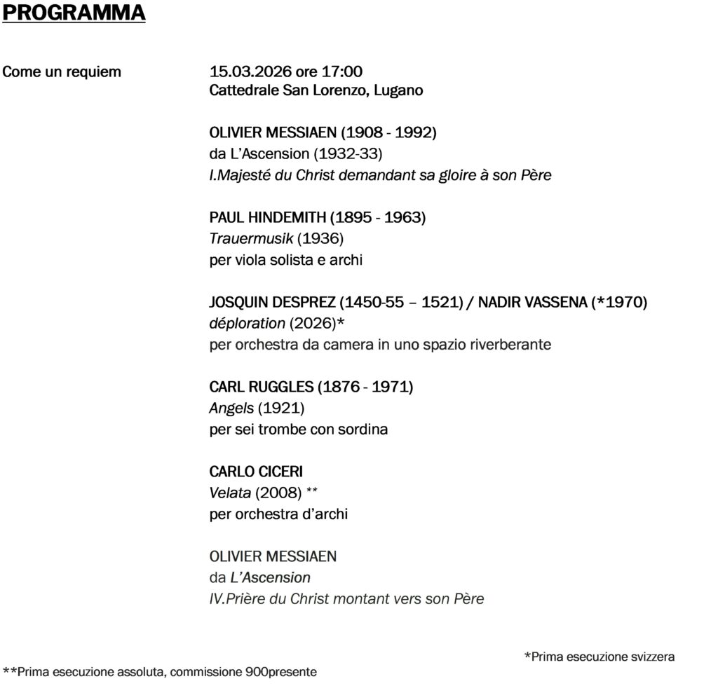 Dalle meditazioni sinfoniche de L’Ascension di Olivier Messiaen alla Trauermusik per viola e archi di Paul Hindemith, ogni brano riflette una personale spiritualità, declinata con forme e linguaggi differenti. Di rarissimo ascolto è il brano Angels del compositore americano Carl Ruggles, per sei trombe con sordina, una miniatura dal fraseggio denso ed introspettivo. Completano il programma la prima esecuzione svizzera di Velata di Carlo Ciceri, delicato omaggio ad un’amica scomparsa, e la prima assoluta di una raffinata rilettura di Nymphes des bois di Josquin Desprez ad opera di Nadir Vassena, intitolata “déploration”.